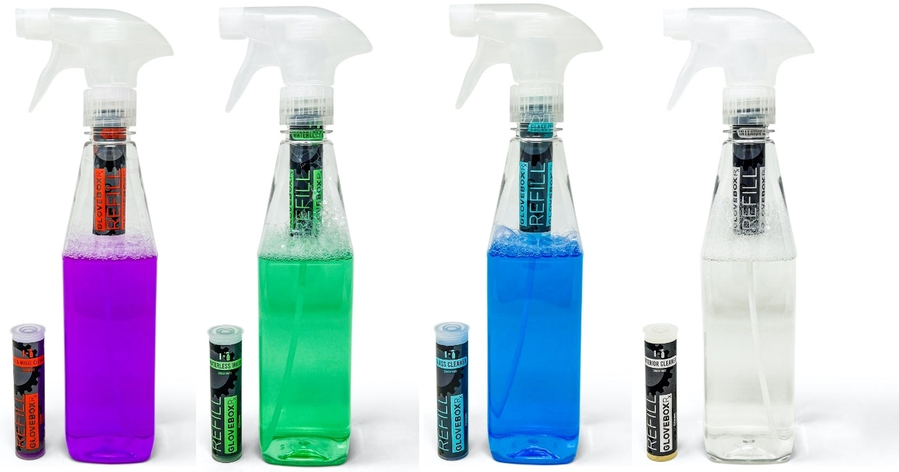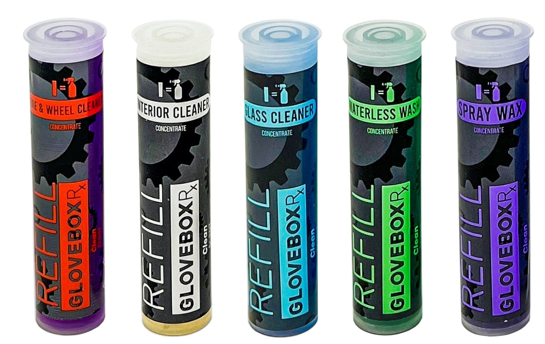 Meet GLOVEBOXRx™ - the revolutionary car care system that completely changes the way we buy and use detailing products. Traditional cleaning products are 99% water, which means you're (mostly) paying to ship, use, and store someone else's water. Not anymore! Now you can get that perfect shine at a fraction of the cost - when your bottle is empty you simply REFILL. RELOAD. REUSE.